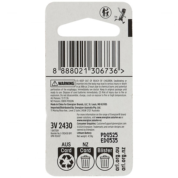 | Description | Energizer CR2430 3V Lithium Coin Cell | |